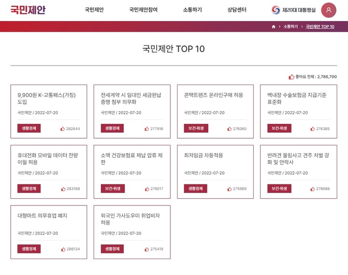 24일 오전 11시 15분 기준으로 대형마트 의무휴업 폐지 제안은 28만6131건의 ‘좋아요’를 획득해 10건의 제안 중 가장 호응이 많았다.