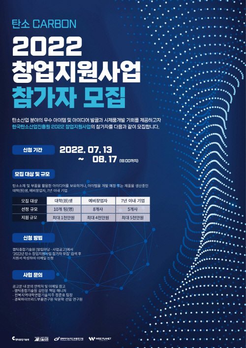 산업통상자원부와 한국탄소산업진흥원과 주최하고 캠틱종합기술원이 주관하는 ‘2022 탄소 창업지원 사업’은 우수창업 아이디어 및 아이템 발굴 활성화를 통한 탄소 사업 저변확대와 기술 피벗 지원을 통한 초기 창업자의 기술고도화 및 사업 활성화를 지원하는 사업이다.
