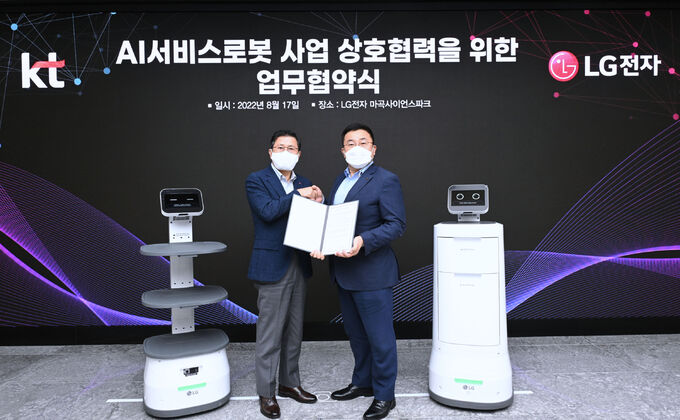 KT 역시 지난 2019년 12월 처음 선보인 ‘AI호텔로봇’을 시작으로 F&B(식음료) 배달로봇, 고령층 돌봄서비스용 AI케어로봇, 감염병 예방을 위한 방역로봇, 자율주행 실외 배송 로봇 등 다양한 분야의 로봇 상용화에 나서고 있다. KT는 앞으로 LG전자가 보유한 다양한 서비스로봇들을 신속히 고객 생활 속으로 전파하고, 축적된 고객 경험을 기반으로 새로운 로봇 개발에도 협력한다는 계획이다.