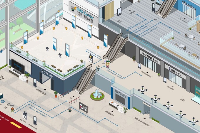 포스코건설 메타스페이스에 접속해 포스코건설 송도사옥으로 들어가면 여의도 파크원, 광양 LNG 터미널 등 포스코건설의 대표 강건재 프로젝트를 살펴볼 수 있는 ‘강건재 타운’이 1층에 있다. 이외에 2층에는 ‘포스코건설 홍보관’과 ‘더샵 라운지’, 3층과 4층에는 회의실, 글로벌아카데미, 컨퍼런스홀 등 회의·사내교육·행사를 위한 공간을 마련했다..