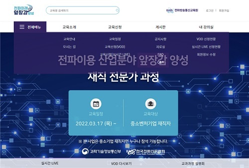 이번 교육은 11월 17일까지 양방향 실시간 온라인 교육으로 진행되며, 앞서 진행된 전파를 이용하는 디지털 혁신 산업 ‘스마트제조, 스마트팜, 스마트드론, 스마트시티, 전파소재부품’ 등 교과과정도 VOD과정으로 연말까지 교육 참여가 가능하다.