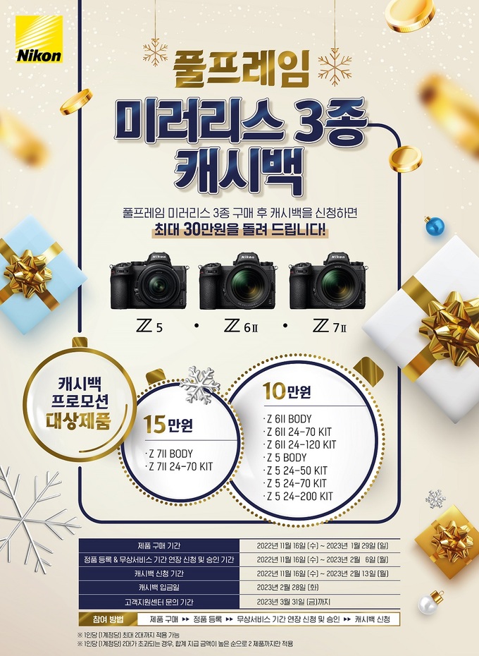 이번 행사는 니콘 인기 미러리스 Z 5, Z 6Ⅱ, Z 7Ⅱ를 대상으로 10만원부터 최대 30만원까지 캐시백 혜택을 제공하는 형식이다. 카메라 바디 단품을 포함해 Z 5 24-50 KIT, 24-70 KIT, 24-200 KIT, Z 6Ⅱ 24-70 KIT, 24-120 KIT, Z 7Ⅱ24-70 등 총 9종이 대상이다.