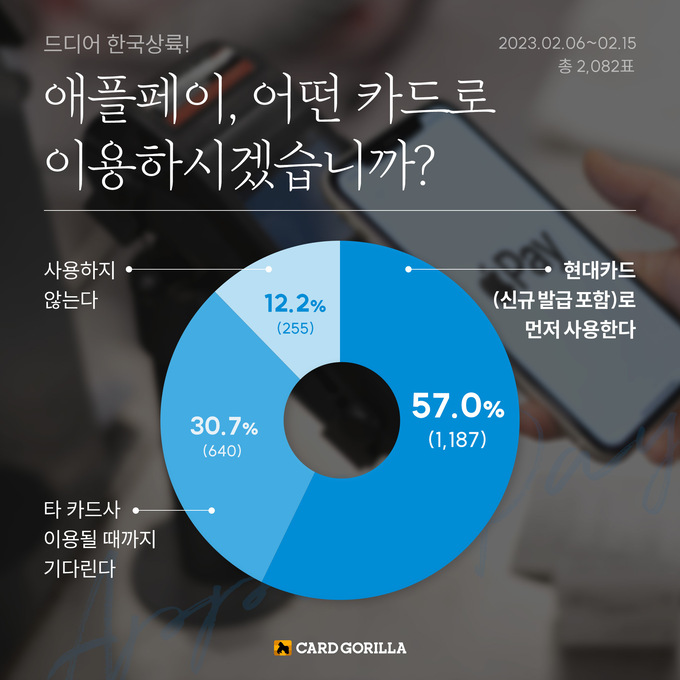 조사 결과 과반수(57.0%, 1,187표)가 ‘현대카드(신규 발급 포함)로 애플페이를 먼저 사용하겠다’고 응답했다. 2위는 ‘타 카드사 이용될 때까지 기다린다’(30.7%, 640표)가 차지했다. 한편 ‘사용하지 않는다’도 12.2%(255표)에 달했다.