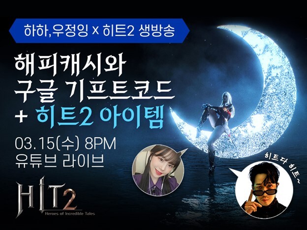 업체에 따르면 해당 방송은 오는 15일 오후8시부터 60분간 넥슨 히트2 공식유튜브채널에서 라이브로 송출되며 하하, 우정잉이 진행을 맡는다. 15일 방송 시간부터 3월 21일까지 해피머니사이트에서는 구글기프트코드 결제수수료를 면제해 판매할 예정이다. 결제 수수료 면제 와 더불어 해당 기간동안 해피머니에서 구매한 구글플레이 기프트코드를 계정에 충전할 시 히트2 인게임 아이템을 자동으로 지급받을 수 있다. 5만원권부터 20만원권까지 적용되며 권종별로 이벤트 특별기념 혜택인 빛나는 구글 상자 아이템을 받을 수 있다.