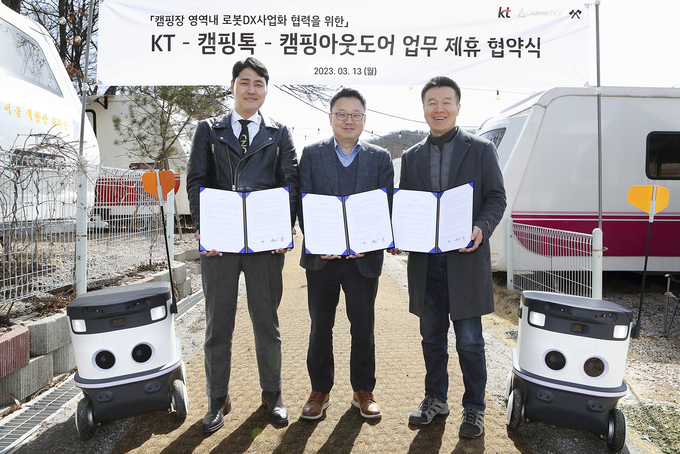 KT가 캠핑톡, 캠핑아웃도어와 함께 서울 북한산 글램핑장에서 실외자율주행로봇 사업 확산을 위한 MOU를 체결했다고 14일 밝혔다.