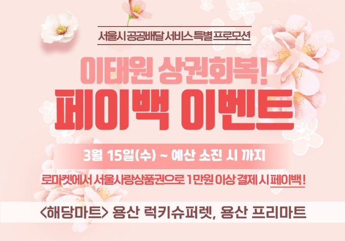이벤트 기간은 15일부터 예산 소진 시까지이며, 서울사랑상품권으로 로마켓 앱을 이용하는 소비자에게 1만원 이상 결제 시 3000원, 2만원 이상 결제 시 6000원의 페이백 상품권을 준다.