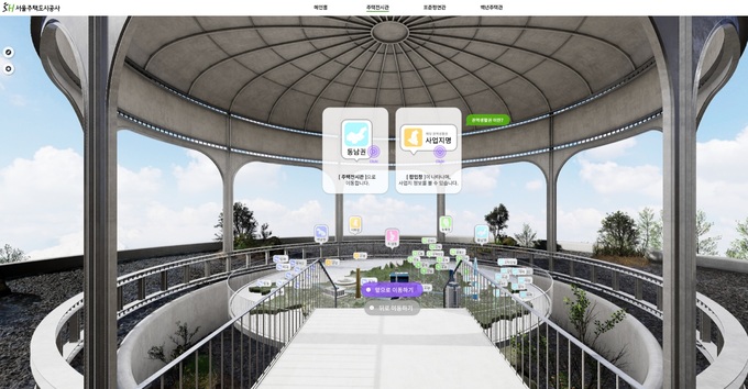SH 메타 서울은 국내 최초로 시도한 서울시 실물 지도 기반의 메타버스로 SH공사의 서울 전역 123개의 사업지 정보를 도심권, 동북권, 동남권, 서북권, 서남권 등 권역별로 나눠서 찾아볼 수 있다.
