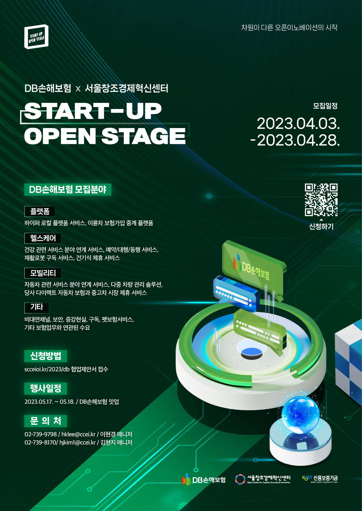 DB손해보험은 이달 28일까지 오픈이노베이션 프로그램인 ‘2023, 4th DB손해보험×서울창조경제혁신센터 오픈스테이지’에 참여할 스타트업을 모집한다고 6일 밝혔다.