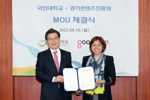 국민대학교(총장 임홍재)가 경기콘텐츠진흥원(원장 민세희)과 지난 10일 국민대학교 본부관 203호에서 콘텐츠 및 디자인의 발전에 기여하는 개발·연구 등을 공동으로 추진하기 위한 업무협약(MOU) 체결식을 가졌다고 13일 밝혔다.
