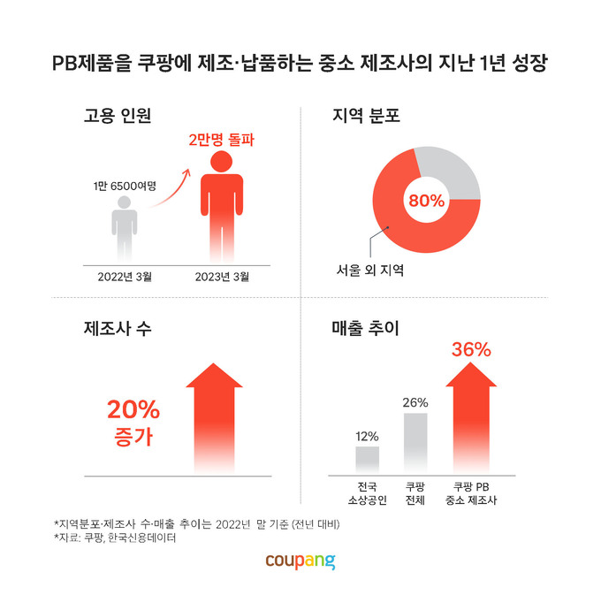 쿠팡의 자체 브랜드(PB) 상품을 제조, 납품하는 중소 제조사들의 고용 인원이 2만명을 돌파하고 매출도 큰 폭으로 뛴 것으로 나타났다.
