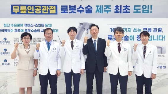 혜인의료재단 한국병원(병원장 한승태, 이사장 고흥범, 이하 제주한국병원)이 제주지역 최초로 인공관절 수술로봇 ‘CUVIS-joint(이하 큐비스-조인트)’를 도입하고 가동식을 마쳤다고 23일 밝혔다.