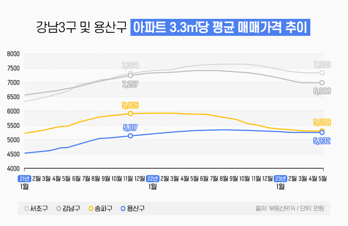 2021년 11월 용산구와 송파구 집값 격차는 788만원까지 벌어졌으나, 이후 용산구 집값이 빠르게 오르면서 18개월 연속으로 격차를 좁혔다. 이 기간 동안 송파구의 집값은 5905만원에서 5288만원으로 617만원 하락해 서울에서 두 번째로 큰 하락폭을 기록했다. 반면 용산구는 5117만원에서 5232만원으로 115만원 올라 서울에서 가장 큰 상승폭을 기록했다.
