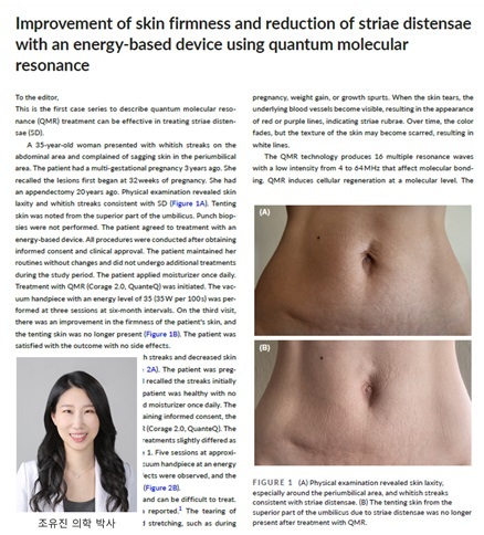 QMR(Quantum Molecular Resonance, 양자분자공명) 치료가 복부 탄력 개선 및 튼살(SD, Striae Distensae)을 감소시키는 데 효과적일 수 있다는 국내 의료진의 논문이 SCI급 국제 학술지 '저널 오브 코스메틱 더마톨로지(Journal of Cosmetic Dermatology)'에 이달 7일 게재됐다.