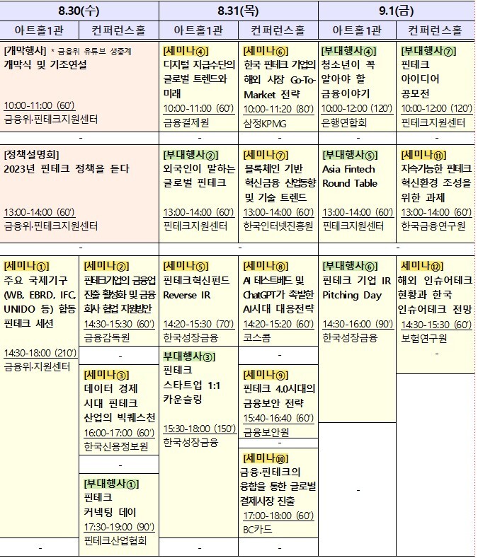 개막행사에서는 김주현 금융위원장의 환영사를 비롯해 소프넨두 모한티 싱가포르 통화청 CFO 등 국내외 연사들의 기조연설이 진행된다. 연사들은 그간의 글로벌 핀테크 산업 성장세를 조망하고, 핀테크와 금융산업의 미래를 전망하는 메시지 등을 전달할 예정이다.