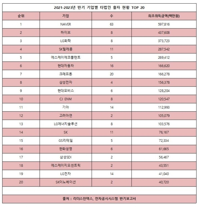 LG화학이 8개 기업에 3737억원, SK텔레콤이 11개 기업에 2694억원의 지분을 출자했다. 현대자동차는 16개 기업에 1666억원의 지분출자를 했으며 크래프톤이 20개 기업에 1663억원을 출자한 것으로 나타났다.