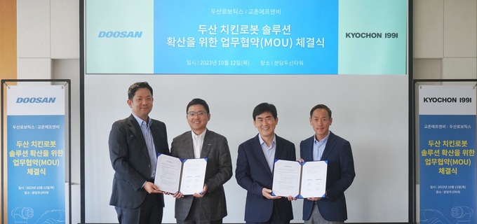 교촌에프앤비와 협동로봇 종합솔루션기업 두산로보틱스가 지난 12일 ‘치킨로봇 솔루션 확산’을 위한 업무협약(MOU)을 맺고, IT 서비스 혁신을 통한 매장 효율화를 가속화한다고 16일 전했다.