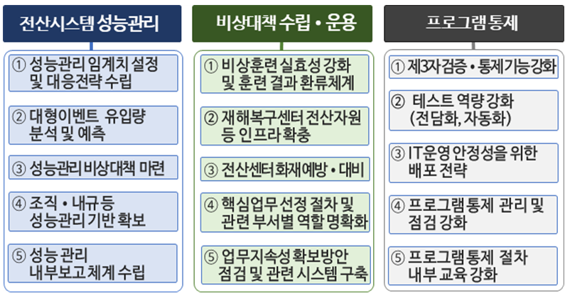 IT부문 비상대책 수립 부문에서는 화재 등 비상상황 발생시 전자금융서비스가 장기간 중단되는 사고 예방하기 위한 목적으로 주전산센터 마비시에도 핵심업무를 수행할 수 있도록 재해복구센터 인프라(DB·서버·통신망 등)를 충분히 확보한다. 또 실제 비상상황 발생시에도 전자금융서비스가 신속하게 복구 가능하도록 비상대응 훈련의 범위 확대한다.