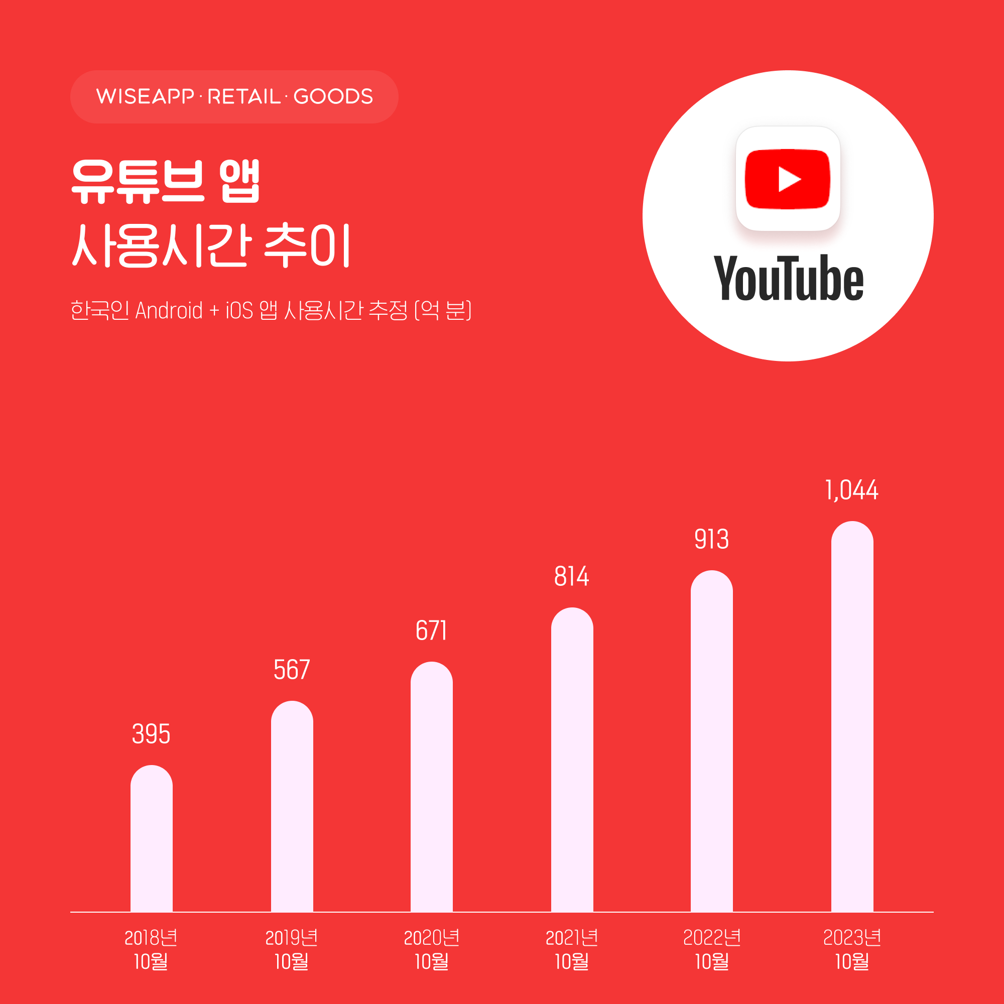 앱/리테일 분석 서비스 와이즈앱·리테일·굿즈는 한국인 스마트폰 사용자(Android+iOS)를 표본 조사한 결과, 지난 10월 유튜브 사용시간은 1044억분을 기록했다고 15일 밝혔다. 2020년 동기 대비 1.6배 증가한 수치다.