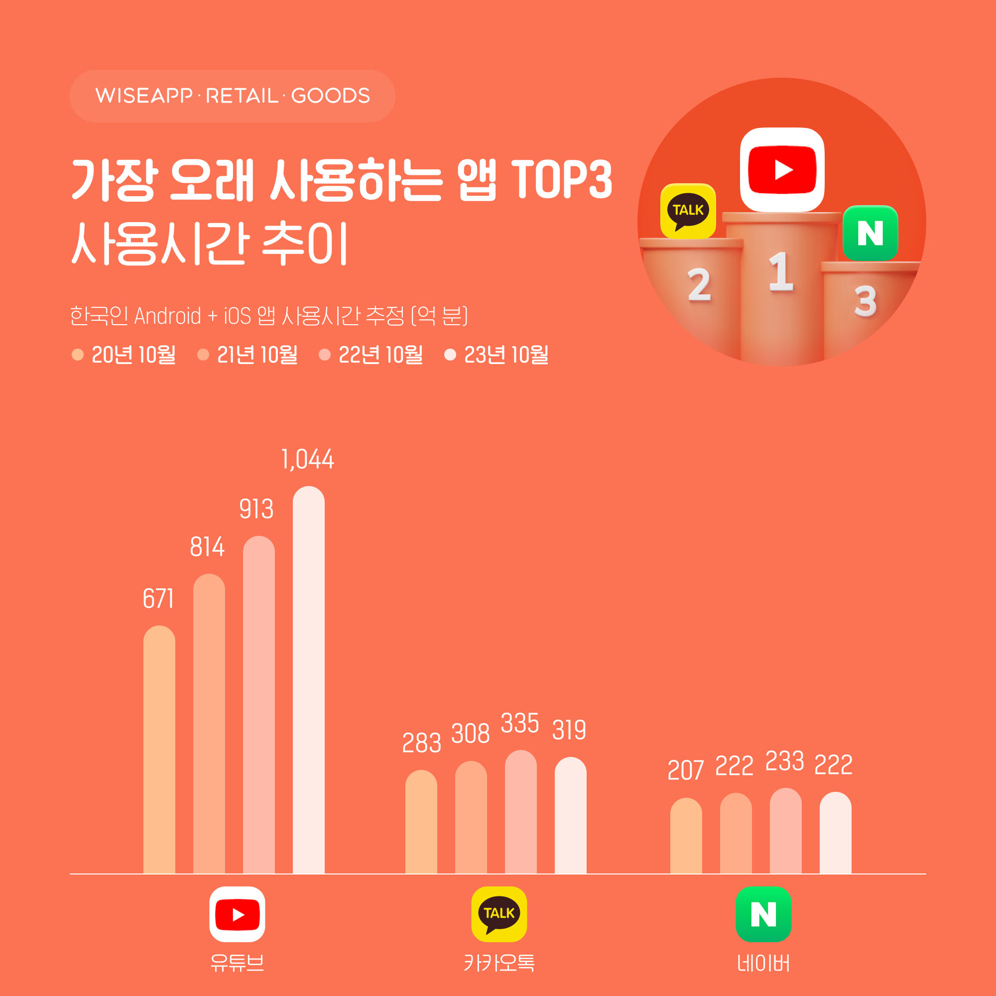 유튜브 사용시간은 카카오톡 사용시간 319억 분보다 약 3배, 네이버 사용시간 222억 분보다 약 5배나 많았다. 특히 사용시간 격차는 매년 벌어지고 있는 것으로 분석됐다.