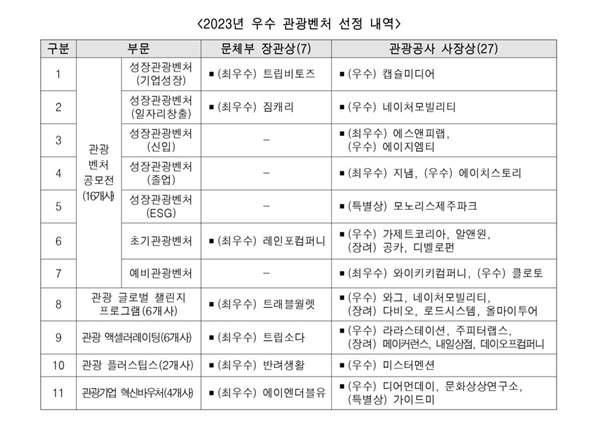 수상 기업들은 공사가 지원하는 관광벤처기업 중 2023년 연간 매출실적, 고용창출, 관광산업 기여도 등 성과평가를 통해 결정됐고 7개 기업이 문체부 장관상을, 27개 기업이 관광공사 사장상을 받았다.