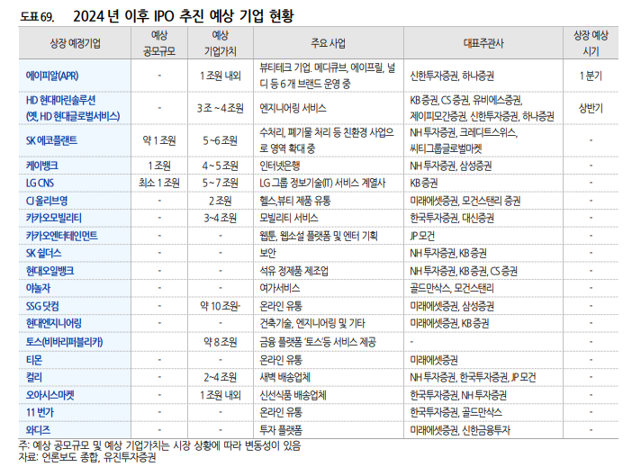 최 연구원은 “지난해 말 증시의 반등과 함께 IPO 시장의 높아진 관심으로 그간 상장을 미룬 ‘대어급’ 기업들의 신규 상장이 올해부터 되살아날 전망”이라며 “의미 있는 반등을 기록한 지난해와 비교해 올해 IPO 시장은 대세 상승을 이어갈 것”이라고 전망했다.