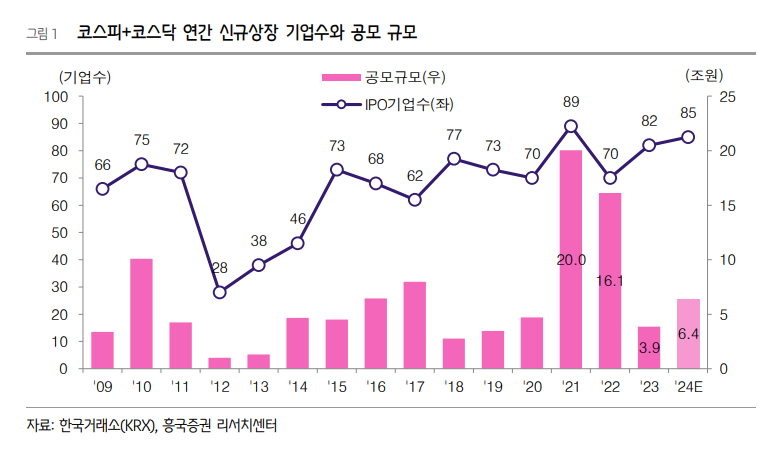 최종경 흥국증권 연구원은 “신규 상장을 대기하고 있는 물량, 연초 잔존 물량에 해당하는 청구서 접수 이상 단계의 기업들을 집계해 보면 2021년 초 49개, 2022년 초 55개, 2023년 초 52개, 2024년 초 57개 기업이 대기 번호표를 받고 진행 중일 정도로 견조한 추세를 이어가고 있다”고 설명했다.