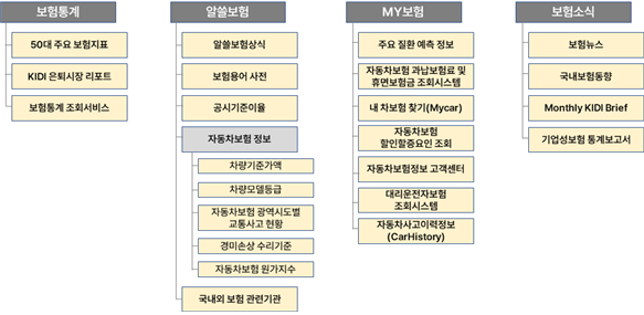 보험통계는 연간 1인당 납입보험료, 자동차보험 가입대수 등 보험 관련 통계를 쉽고 편하게 조회할 수 있는 메뉴로 구성된다. 소비자들이 관심을 가질만한 간단한 보험통계 50개를 모아서 보여주는 ‘50대 주요 보험지표’를 비롯해 은퇴를 준비하는 소비자들에게 유용한 정보를 제공하는 ‘KIDI 은퇴시장 리포트’와 보험종목별로 계약건수, 가입률, 사망자수 등 세부 실적 데이터를 조회할 수 있는 ‘보험통계 조회서비스’ 등이 있다.