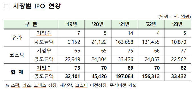 금감원에 따르면 지난해 IPO 기업 수는 82곳으로 전년 대비 12곳(17.1%) 증가한 것으로 나타났다. 공모 금액은 총 3조3000억원을 기록해 전년 대비 78.8% 감소했다. 그러나 2022년 초대형 IPO건에 해당하는 LG에너지솔루션(12조7000억원)을 제외하면 16.0% 증가한 수준이다.