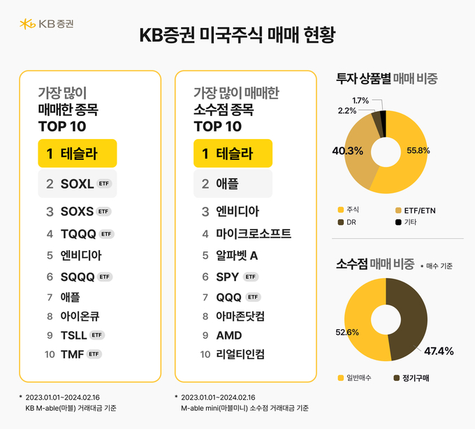 KB증권은 지난해 1월부터 올해 2월 16일까지 KB증권 MTS ‘KB M-able(마블)’과 ‘M-able mini(마블미니)’를 통해 고객들이 가장 많이 매매한 미국주식의 종목 현황을 분석했다고 28일 밝혔다.