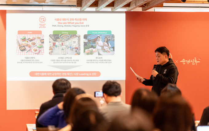 4일 서울 종로구 순대실록 대학로본점에서 신세계푸드의 대안식품 설명회 ‘베러클래스(Better Class)’가 열렸다. 이 자리에는 신세계푸드 송현석 대표와 민중식 R&D센터장이 참석해 대안식품의 개발 방향을 소개했다.