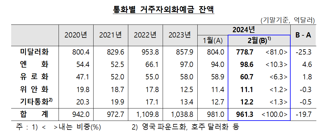 한은 관계자는 “엔화 예금이 지난해 하반기 꺾였다가 2월에 다시 늘었는데 엔저에 일본은행의 통화정책 정상화 기대에 따라 늘었다”고 설명했다.