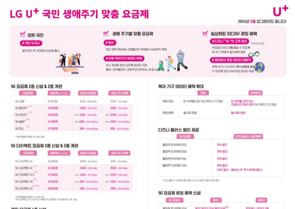 LGU+도 4월 1일부터 기존 중저가 5G 요금제의 데이터 기본 제공량을 확대한다. 월 4만7000원의 ‘5G 슬림+’ 요금제는 6GB에서 9GB로, 월 5만5000원의 ‘5G 라이트+’는 14GB로 늘어난다. 5만9000원에 24GB를 제공하는 ‘5G 베이직+’도 28일 출시한다.