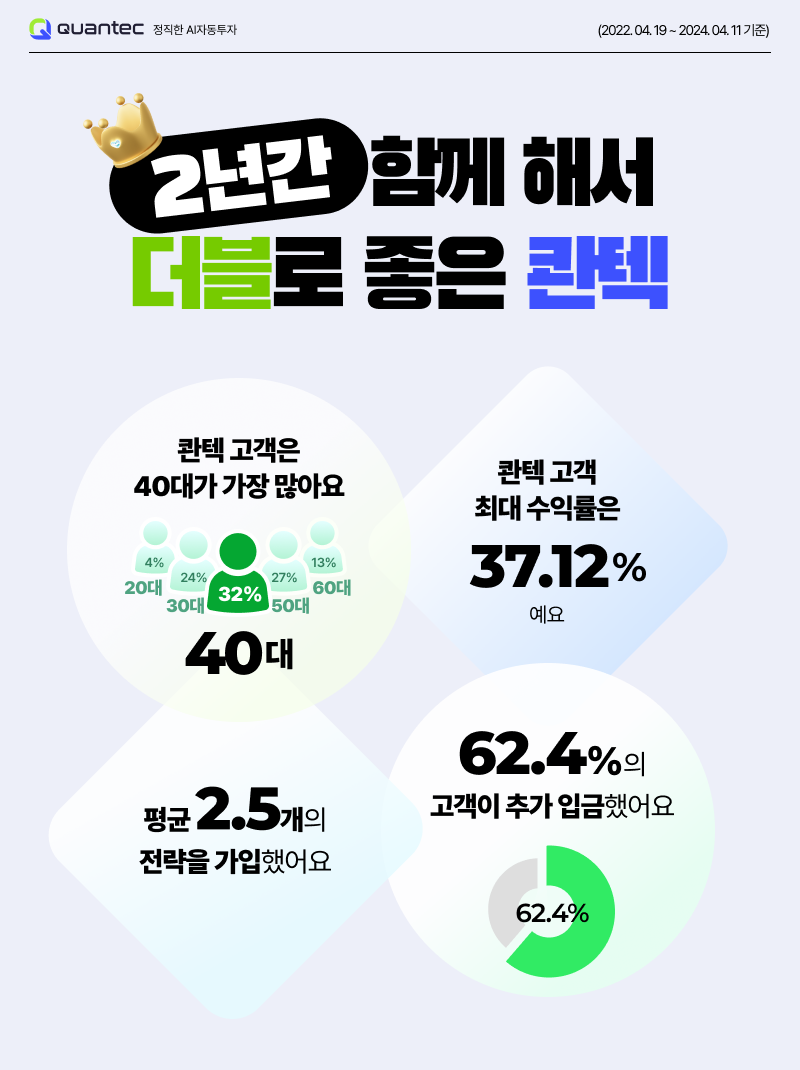 인공지능(AI) 자동투자 플랫폼 콴텍은 지난 2년 간 고객 데이터를 분석한 결과 최대 수익률이 37%를 기록했다고 22일 밝혔다.