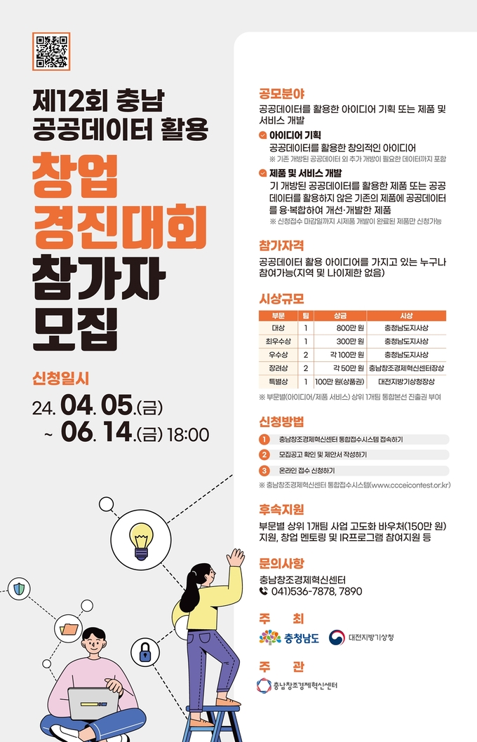 충남창조경제혁신센터에서 ‘제12회 충남 공공데이터 활용 창업경진대회’에 참여할 우수 창업 아이디어를 오는 6월 14일까지 약 2달 동안 모집한다고 2일 밝혔다.