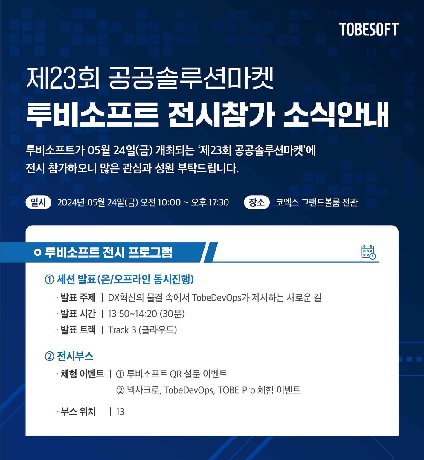 투비소프트는 오는 24일 서울 코엑스 그랜드볼룸관에서 열리는 '제23회 공공솔루션 마켓'에 참가한다고 22일 밝혔다.