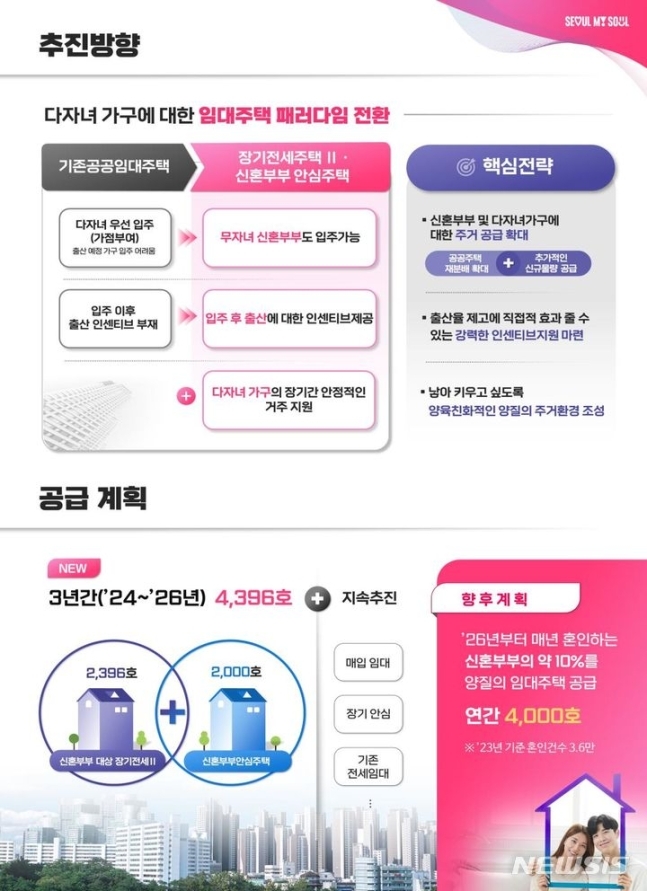 서울시는 29일 이같은 내용을 담은 '저출생 대응 신혼부부 주택 확대방안'을 발표했다. 이번 대책은 신혼부부의 주거 고민을 담은 것으로 '계약기간 최장 20년', '저렴한 내 집 마련' 등 파격적인 혜택을 담고 있다.
