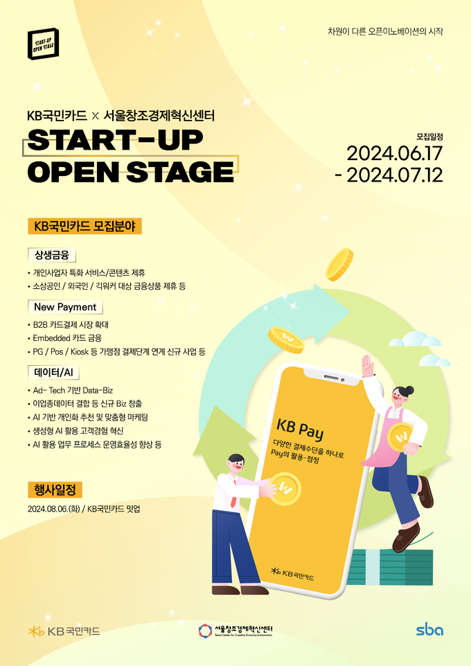 KB국민카드 ‘스타트업 오픈스테이지’ 프로그램 참가 기업 모집은 17일부터 다음 달 12일까지 진행하며, 서울창조경제혁신센터 오픈이노베이션 홈페이지를 통해 접수할 수 있다.