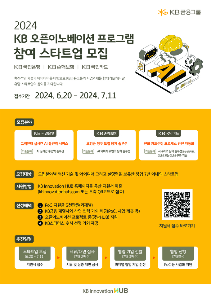 이번 프로그램엔 KB국민은행, KB손해보험, KB국민카드가 참여한다. 혁신 과제는 ▲고객센터 실시간 AI 통번역 서비스(KB국민은행), ▲보험금 청구 서류 위변조 탐지 시스템(KB손해보험), ▲전화 카드 신청 프로세스 완전 자동화(KB국민카드) 등이다. 각 사업별로 한 개 이상의 스타트업이 함께 참여하게 된다.