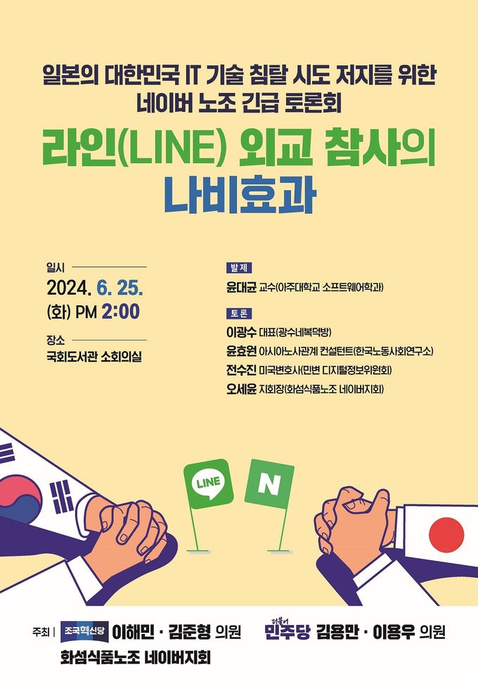 토론회에서는 윤대균 아주대 소프트웨어학과 교수가 ‘라인야후 사태에 대한 진행 경과와 경제안보 시대 데이터 주권’을 주제로 발제한다. 패널 토론에는 이광수 광수네복덕방 대표, 윤효원 한국노동사회연구소 아시아노사관계 컨설턴트, 전수진 민변 디지털정보위원회 미국변호사, 오세윤 화섬식품노조 네이버지회 지회장이 참석한다.
