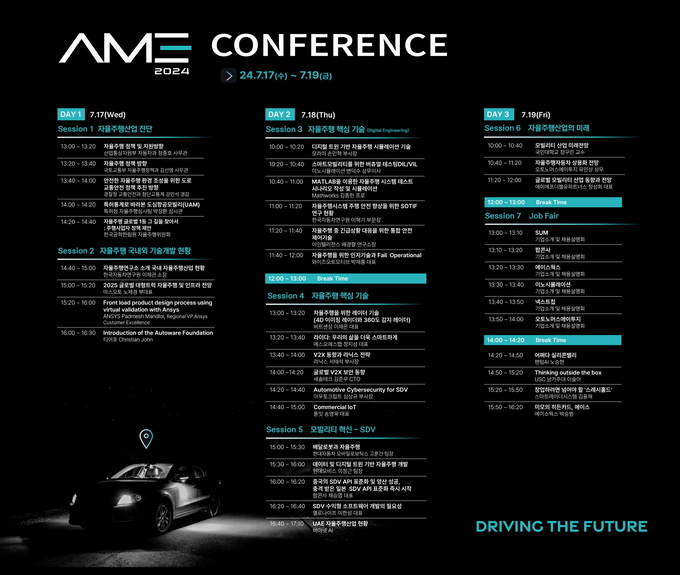 참가 기업 및 업계 종사자를 위한 프로그램으로는 국내·외 판로 개척을 지원하는 ‘한국자율주행산업 공동관’과 함께 자율주행 분야 국내외 현업 전문가가 직접 소개하고 진행하는 ‘자율주행산업 컨퍼런스’가 있다. ‘자율주행 산업 컨퍼런스’는 ▲자율주행산업 진단, ▲자율주행 국내외 기술개발 현황, ▲자율주행 핵심기술 Ⅰ, Ⅱ, ▲모빌리티 혁신-SDV, ▲자율주행산업의 미래 총 6가지 세션으로 17일부터 19일까지 3일간 무료로 진행된다.