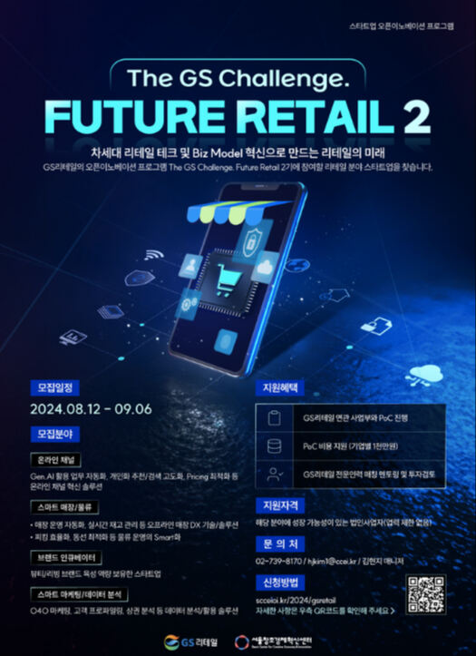 GS리테일은 서울창조경제혁신센터와 협력해 내달 6일까지 오픈이노베이션 프로그램 ‘더 지에스 챌린지 퓨처 리테일 2기’에 참여할 스타트업을 모집한다고 11일 밝혔다.
