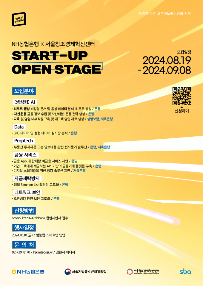 NH농협은행은 서울창조경제혁신센터와 함께 ‘2024 스타트업 오픈 스테이지’에 참여해 범농협 계열사와 협업할 혁신 스타트업을 다음달 8일까지 공개 모집한다고 19일 밝혔다.