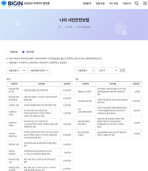 시민안전보험 정보는 대형포털, 각 지자체 홈페이지 등에서도 제공되고 있었으나, BIGIN에서는 ‘비교조회’ 기능이 추가돼 두 가지 지역을 선택해 각 보장 내용을 쉽게 확인할 수 있다.