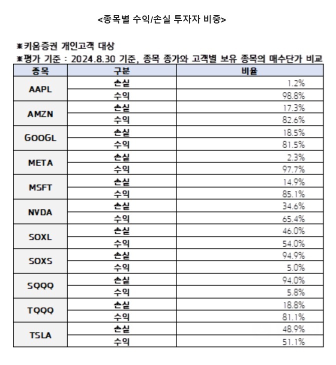고객별 보유 종목의 매수 단가와 지난달 30일 종가를 비교한 개별 종목의 수익권 비중을 보면, 애플과 메타를 보유한 개인 대부분 수익을 냈다. 애플의 수익 투자자 비중은 98.9%, 메타는 97.7%로 나타났다.