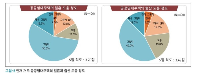 공공임대주택이 출산에 도움이 되는 정도에 대한 물음에는 12.5%가 '매우 그렇다', 45.0%가 '그렇다'고 답했다.