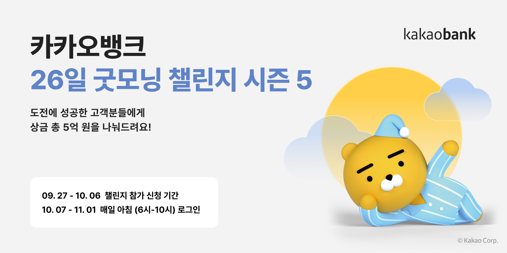카카오뱅크가 미션에 성공한 고객들에게 총 5억원의 상금을 제공하는 ‘26일 굿모닝 챌린지’ 시즌5를 진행한다고 30일 밝혔다.