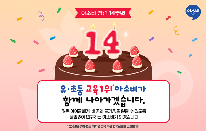 아소비 김정훈 상무는 “창립 14주년을 맞이하게 되어 매우 뜻깊다”며 “지난 14년간 아소비가 걸어온 길은 아이들에게 배움의 즐거움을 전하기 위한 여정이었다. 앞으로도 변함없이 교육의 본질을 지키며 많은 아이들에게 꿈과 희망을 심어줄 수 있는 아소비가 되겠다”고 소감을 전했다.