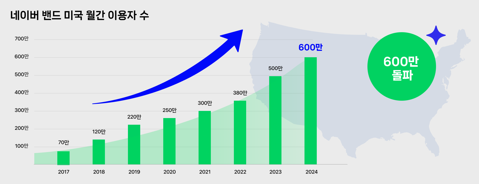네이버 밴드는 지난달 기준 미국 내 월간 활성 사용자 수(MAU) 604만 명을 기록했다고 15일 밝혔다. 현지 시장에서 밴드는 2021년부터 매년 20% 이상 성장세를 꾸준히 이어가며 지난해 10월 500만 MAU를 돌파했고 그후 1년 만에 100만 명의 신규 사용자 유입을 달성했다.