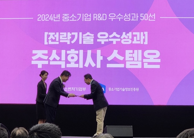 바이오 플랫폼 기술 기업 ㈜스템온(대표 김순학)이 중소벤처기업부 주관 ‘2024년 중소기업 R&D 우수성과 50선’에서 전략기술 분야에 선정되며 중소벤처기업부 장관상을 수상했다고 26일 밝혔다.