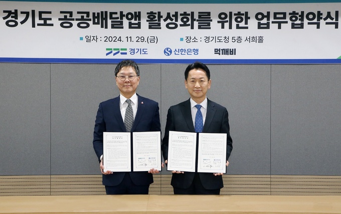신한은행은 지난 29일 경기도 수원시 영통구 소재 경기도청에서 경기도와 공공배달앱 활성화를 위한 ‘땡겨요’ 업무협약을 체결했다고 2일 밝혔다.
